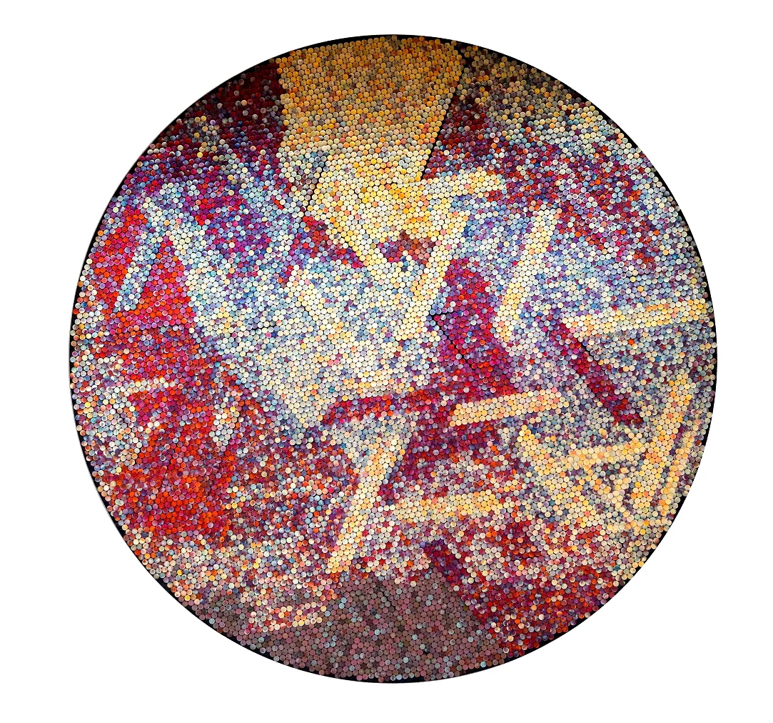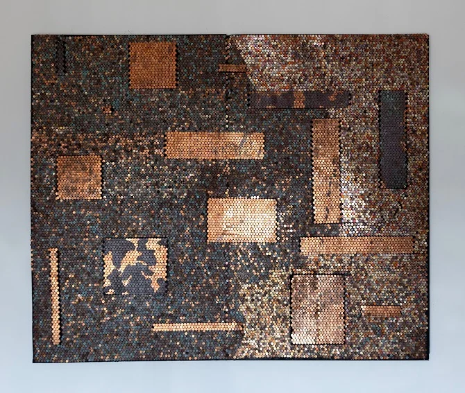 "The pesewa coin installations appropriate Ghana's nearly worthless loose change as structural material for raising questions about state policies, economic practices, and the meaning of independence. As part of another measure to cure the economy’s inflation, these coins were introduced in 2007. Today they have almost no value, and are not accepted by most sellers and informal shops. Ironically, some of the few establishments that use them today are elite supermarkets and stores at the mall. The pesewa creates a paradoxical connection between classes and positions: the currency almost anyone within the system can possess, but which almost no one carries or uses. In my works, thousands of the copper coins are submitted to chemical and natural processes to evoke age and use, then fixed onto metal sheets or wood panels face-down, with the national coat of arms visible. Formed into geometric bodies, geographic and fluid forms, the factions are distinguished by coloration. Just as the coins react to various chemical elements (water, air, heat, vinegar, salt, etc.), reactions emerge between patterns in the construction of the work. Acquired through a series of negotiations with Ghana's banks, the coins navigate the bureaucracies that continue to demarcate social movement. Exhibited as a structural work standing in two and three dimensions, the gleaming cash bank fires urgent embers amidst an allure of gleaming money. The devalued coin transforms into a mechanism for mapping new possible relations, for inventing a more resourceful future." Yaw Owusu