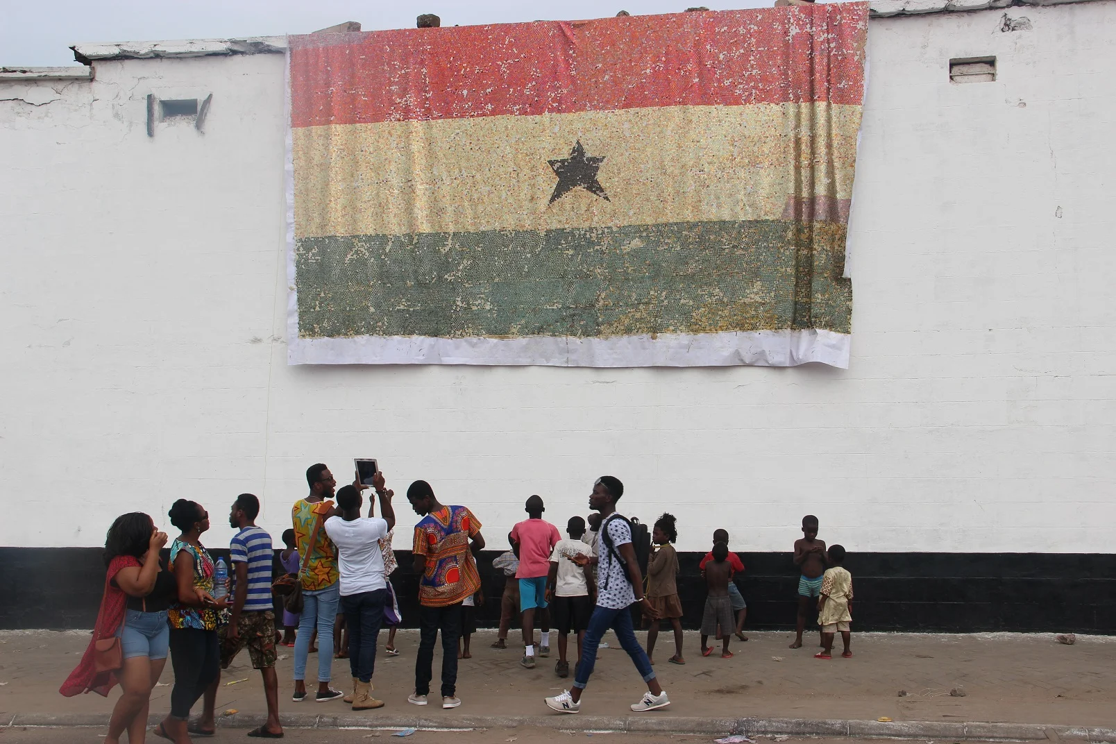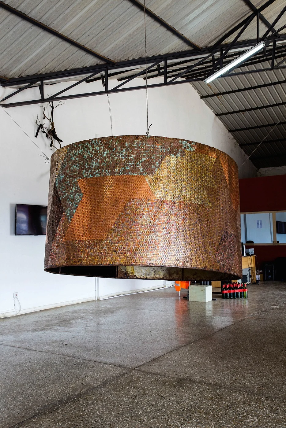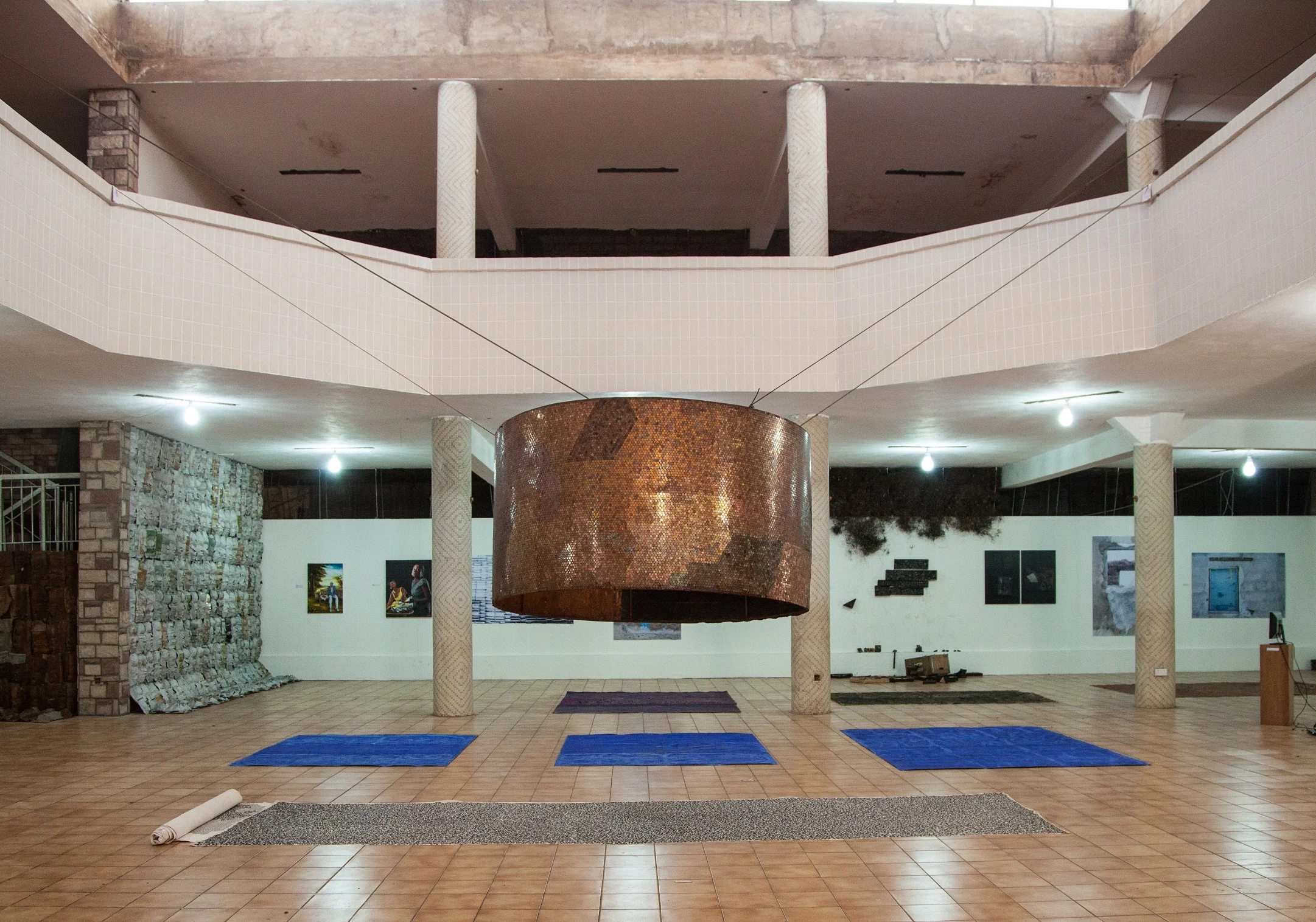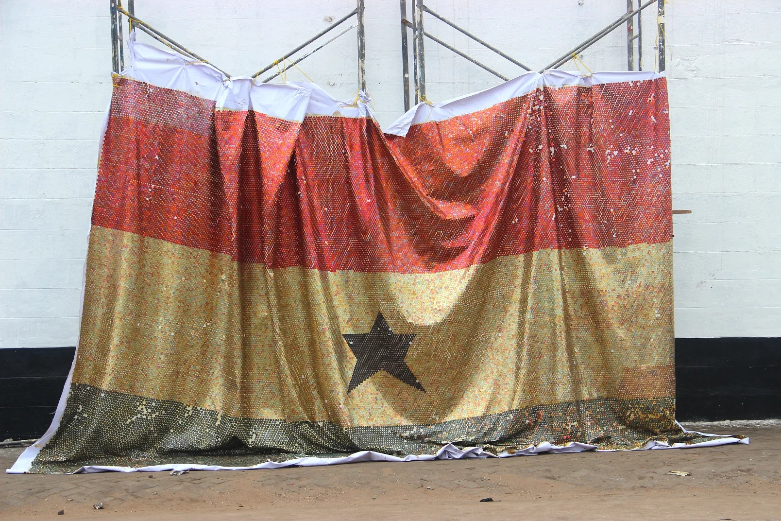 B. 1992. Yaw Owusu creates sculptural installations that repurpose found objects, shifting their value of otherwise-worthless materials into things of value. Built from countless pieces of 1 pesewa Ghanaian coins, his work activates urgent questions around Ghana’s economy, political systems and independence. The currency introduced in an attempt to cure the country’s inflation in 2007, the coins has now almost no value in the financial climate, enabling the artist to use them as a primary material. Typical of Owusu’s approach to working with local agencies to develop his work, the artist acquired the coins through series of negotiations with the central Bank of Ghana – a bureaucratic process that is as important to the artist’s practice as the final works.